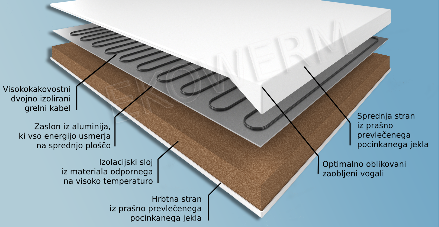 Pomembna prednost izdelkov serije EKOWERM, ki se ponašajo z izredno učinkovitostjo je tudi nižja temperatura hrbtne strani panela. 10 mm debela izolacijska prevleka na hrbtni strani tega infrardečega grelnega panela zagotavlja kar najnižje izgube toplote in enakomerno porazdeljeno ustvarjanje toplote prek grelne površine. Ta izolacijska prevleka zniža temperaturo hrbtne strani tudi do 70 %.